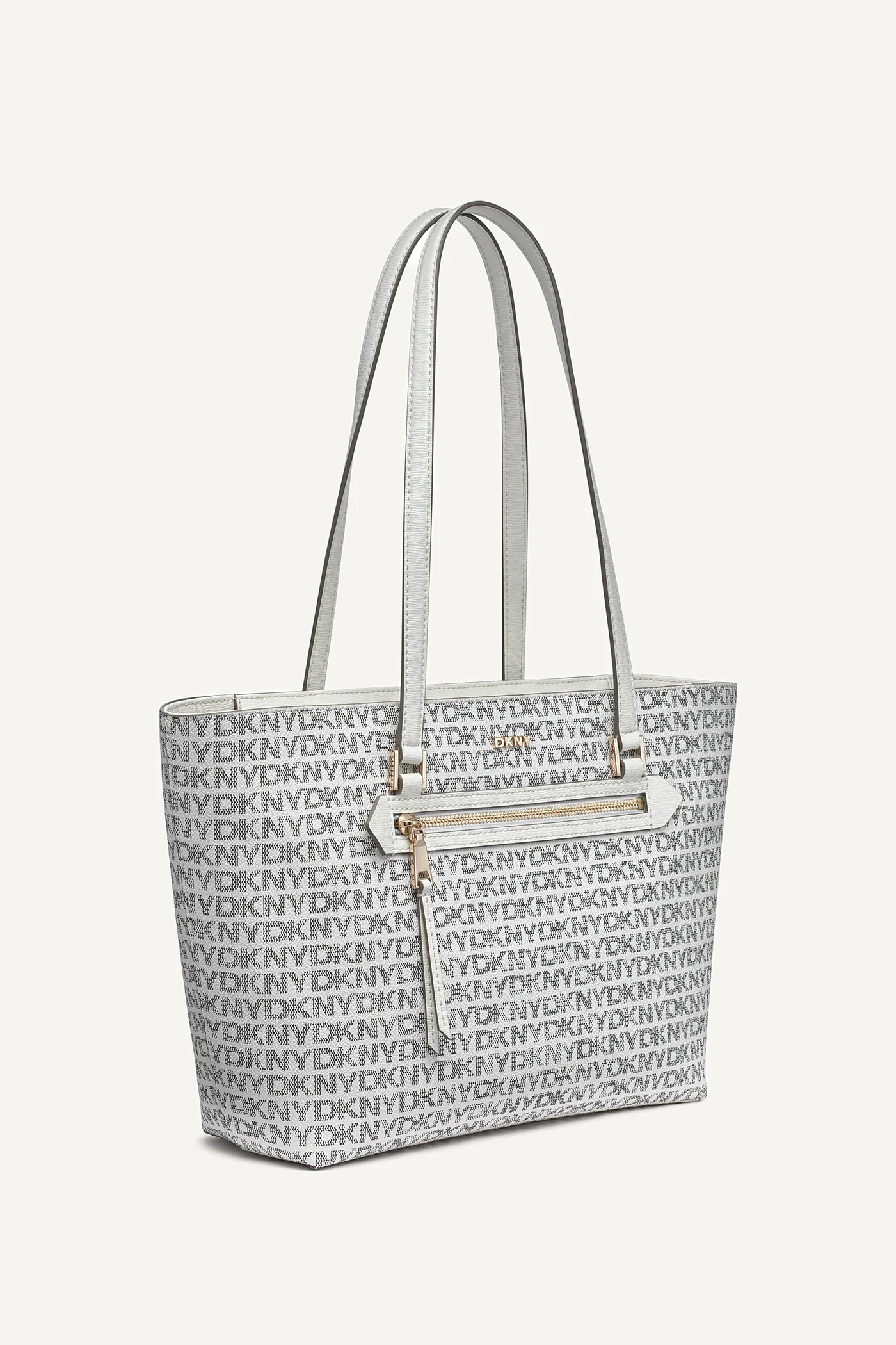 Elevate your style with the DKNY Bryant Ave Medium Tote in pristine white. This sophisticated bag boasts a sleek design, perfect for everyday elegance. Effortlessly versatile, it complements any outfit, making it an essential accessory for fashion-forward individuals.
